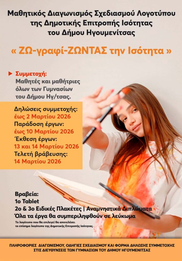➡ Ο Δήμος Ηγουμενίτσας ανακοινώνει την παράταση και επικαιροποίηση των προθεσμιών του Διαγωνισμού Σχεδιασμού Λογοτύπου της Δημοτικής Επιτροπής Ισότητας, με στόχο τη διευκόλυνση της συμμετοχής των μαθητών και μαθητριών, καθώς και την αρτιότερη διοργάνωση της έκθεσης και της τελετής βράβευσης.